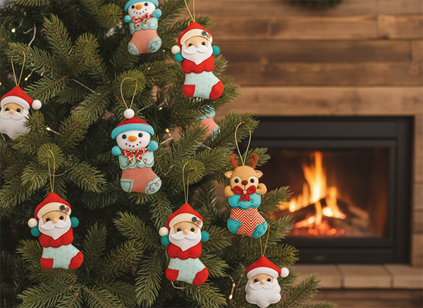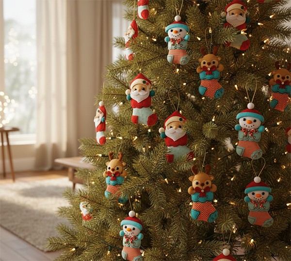 O feltro, com sua textura macia e cores vibrantes, é o material perfeito para confeccionar enfeites de árvore de natal verdadeiramente encantadores. De fato, a característica principal do feltro é a capacidade de conferir um toque de fofura inigualável às peças, como você vê na imagem.