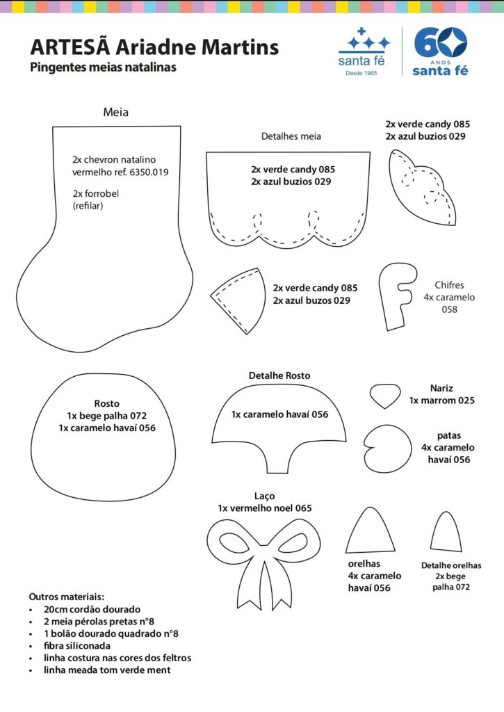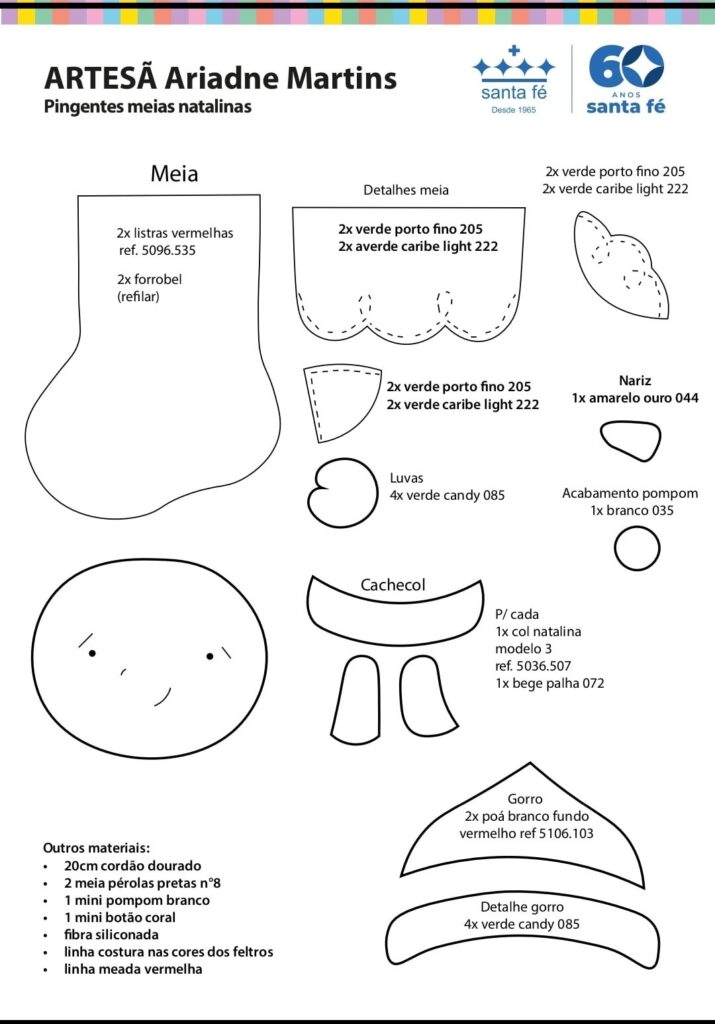 Em seguida, com os moldes prontos para download, você simplesmente recorta o feltro, cola as partes ou costura à mão, e preenche para criar um adorável enfeite de natal. Nesse sentido, o processo é divertido, terapêutico e acessível tanto para iniciantes quanto para artesãos experientes. Por outro lado, se você prefere agilizar a produção, use a sua máquina de costura sem problemas.